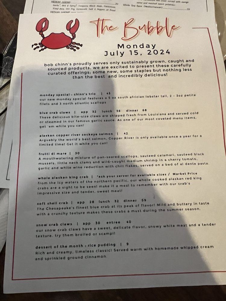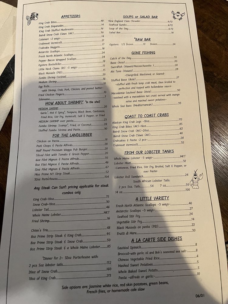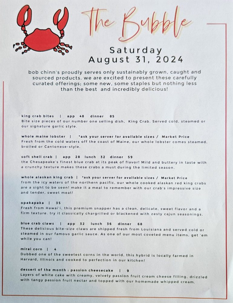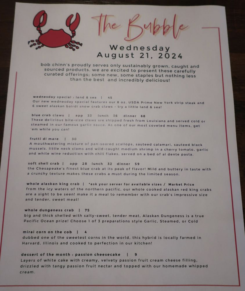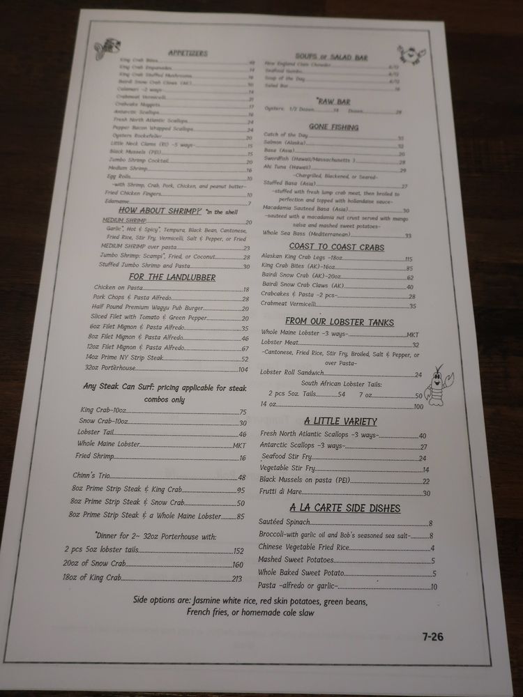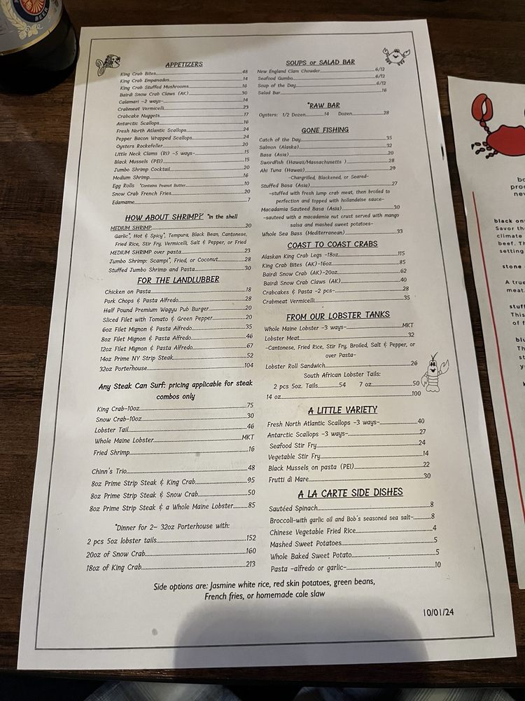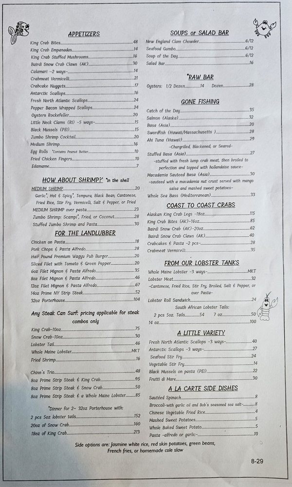 Introducing the menu at Bob Chinn's Crab House, a renowned seafood and steakhouse in Wheeling, IL. This restaurant offers a wide range of options for all dietary preferences, including keto and vegetarian dishes. With a casual atmosphere and moderate noise level, Bob Chinn's is perfect for lunch, dinner, or even group gatherings. The menu features fresh seafood, juicy steaks, and a full bar with happy hour specials. Guests can enjoy outdoor seating, private dining, and even drive-thru service. The restaurant is wheelchair accessible and offers amenities such as free Wi-Fi and TV. With a focus on sustainability, Bob Chinn's provides compostable containers and reusable tableware. Overall, Bob Chinn's Crab House is a must-visit for a delicious dining experience with a variety of options to satisfy every craving.